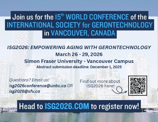 The countdown to the 15th World Conference of the International Society for Gerontechnology (ISG 2026) has begun! From March 26-29, 2026, globally recognized experts in gerontechnology will gather in Vancouver, Canada, and you could share the spotlight with them. Our abstract submission system is open – why wait? This is your opportunity to showcase your research findings, spark new ideas, and connect with invited speakers and fellow gerontechnologists from around the world. Whether you are planning on a free paper or a poster or submitting an abstract for a symposium, the platform is ready! The submission deadline is December 1, 2025, but early submissions help us plan a more dynamic program and give you and your research visibility sooner.