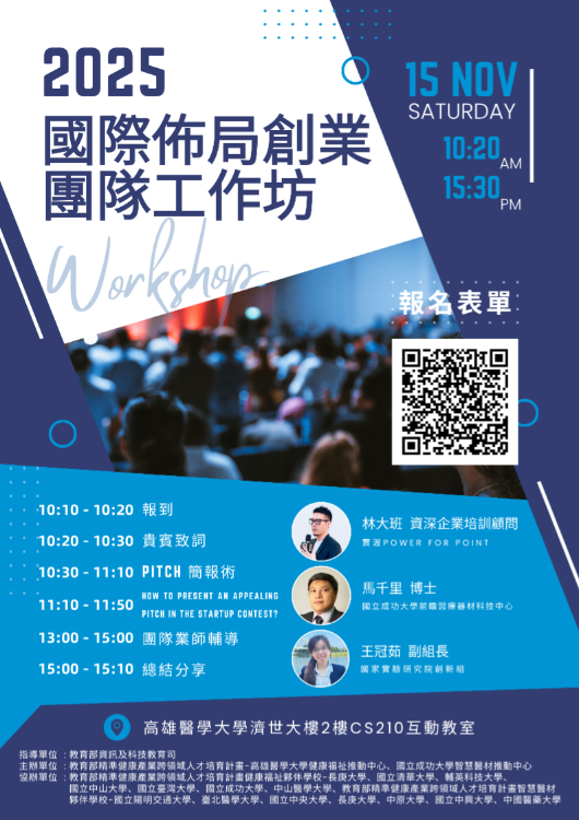 高醫X成大「2025國際佈局創業團隊工作坊」 想將創意或創業視野拓展至國際市場嗎?趕快加入2025國際佈局創業團隊工作坊!!透過實戰演練與專家指導,打造具備全球競爭力的跨國佈局!!